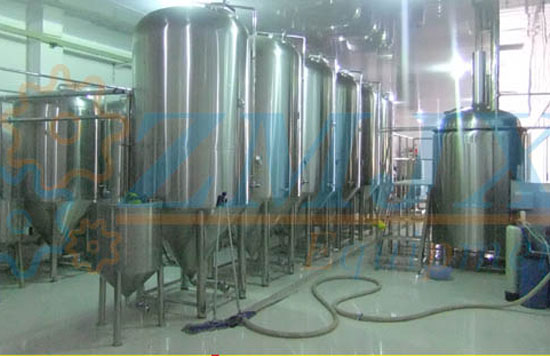 啤酒發(fā)酵系統(tǒng)有發(fā)酵罐、清酒罐、暫存罐組成;發(fā)酵是啤酒生產(chǎn)中極其重要的工藝過(guò)程。是一個(gè)有酵母參與的復(fù)雜的生化反應(yīng)過(guò)程,發(fā)酵罐為錐底圓柱形,罐體具備自身冷卻裝置,可很容易地控制發(fā)酵溫度;罐底為錐形,回收酵母及清洗都很方便;罐體具有CIP清洗系統(tǒng),保證了生產(chǎn)中的衛(wèi)生安全。具備了先進(jìn)的國(guó)際發(fā)酵工程技術(shù),可采用PLC自動(dòng)控溫技術(shù)。全過(guò)程控制啤酒發(fā)酵。