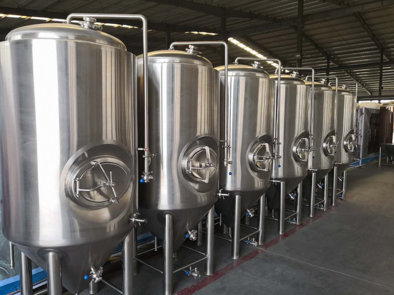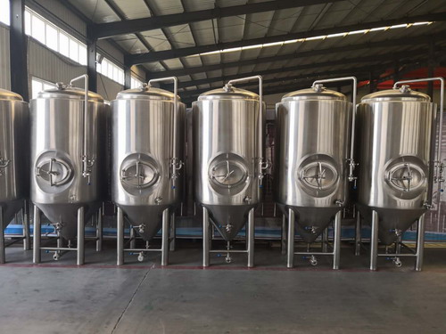 啤酒發(fā)酵系統(tǒng)有發(fā)酵罐、清酒罐、暫存罐組成;發(fā)酵是啤酒生產(chǎn)中極其重要的工藝過程。是一個有酵母參與的復雜的生化反應過程,發(fā)酵罐為錐底圓柱形,罐體具備自身冷卻裝置,可很容易地控制發(fā)酵溫度;罐底為錐形,回收酵母及清洗都很方便;罐體具有CIP清洗系統(tǒng),保證了生產(chǎn)中的衛(wèi)生安全。具備了先進的國際發(fā)酵工程技術,可采用PLC自動控溫技術。全過程控制啤酒發(fā)酵。